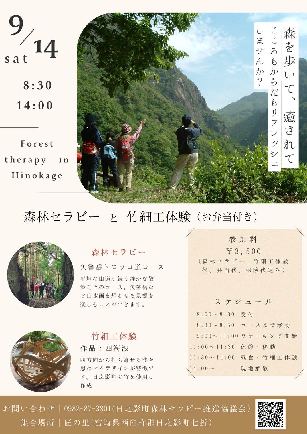 森林セラピーと竹細工体験イベント カレンダー カレンダーに追加 Timely カレンダーに追加 Google に追加 Outlook に追加 Apple カレンダーに追加 他のカレンダーに追加 XML ファイルとしてエクスポート 日時: 2024年9月14日 @ 8:30 AM – 2:00 PM 2024-09-14T08:30:00+09:00 2024-09-14T14:00:00+09:00 場所: 森林セラピー 矢筈岳トロッコ道コース他 参加費: 3500円 お問い合わせ: 日之影町森林セラピー推進協議会 0982-87-3801 (日之影町役場地域振興課) イベント ツアー 日之影町内の森林セラピーコースの中でも人気のコース、「矢筈トロッコ道」が台風被害を乗り越えて一部復旧しました! この矢筈トロッコ道を経験豊富なガイドと巡るセラピーツアーイベントが開催されます! 森林セラピーで五感を研ぎ澄まし、山の自然に囲まれて癒し効果を得る時間を過ごしませんか? セラピーの後は日之影町の伝統工芸の一つ、竹細工を体験。竹のおもしろさ、工芸の奥深さを学べます。