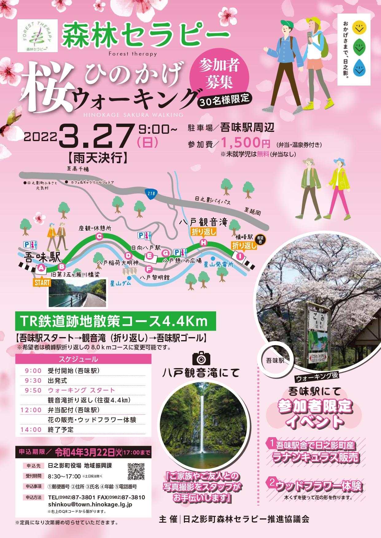 日之影町の吾味駅から続く森林セラピーロード・TR鉄道跡地散策コースから春のウォーキングが行われます。 TR鉄道跡地散策コース4.4Kmを歩きます。【吾味駅スタート→観音滝(折り返し)→吾味駅ゴール】