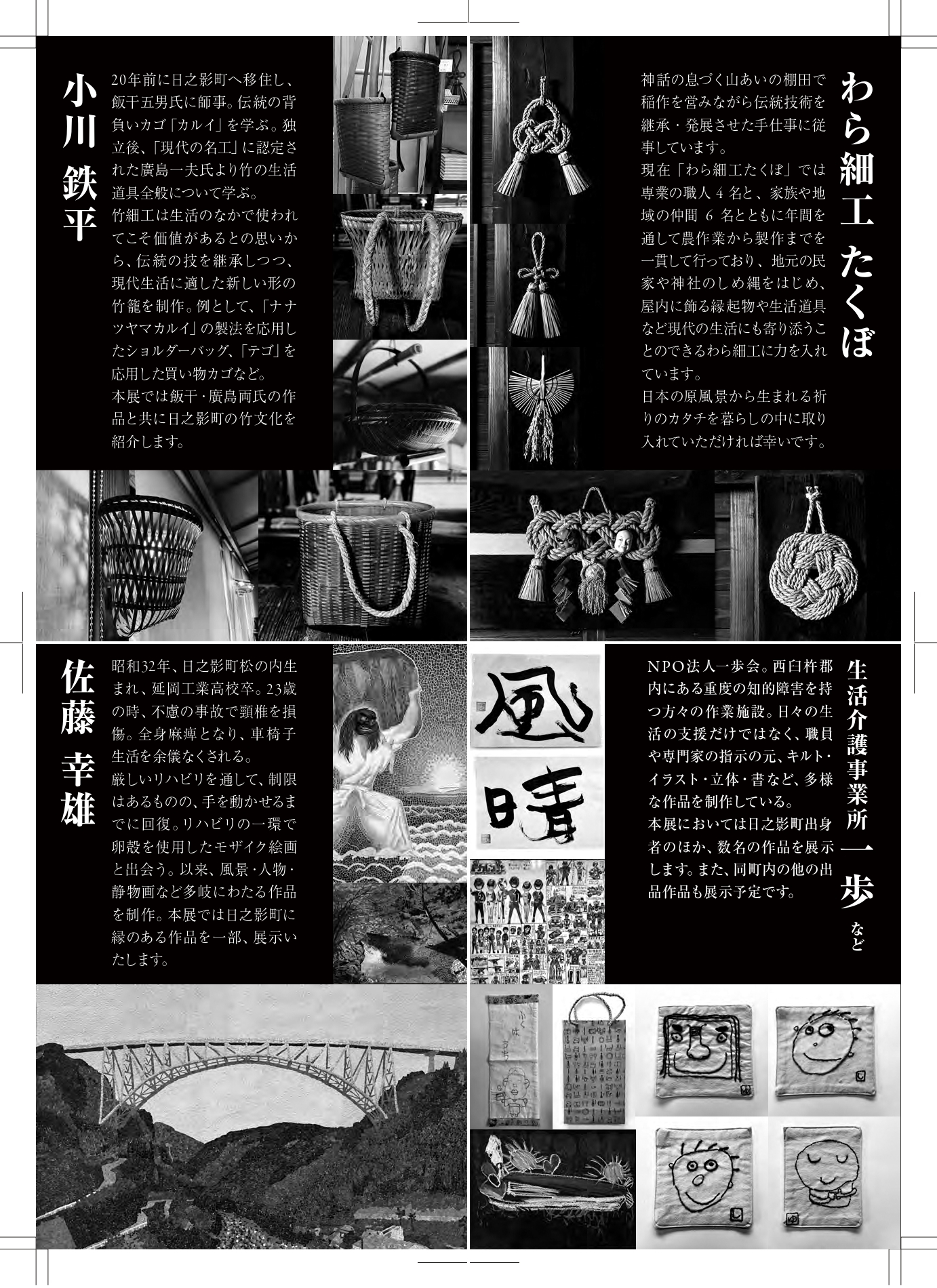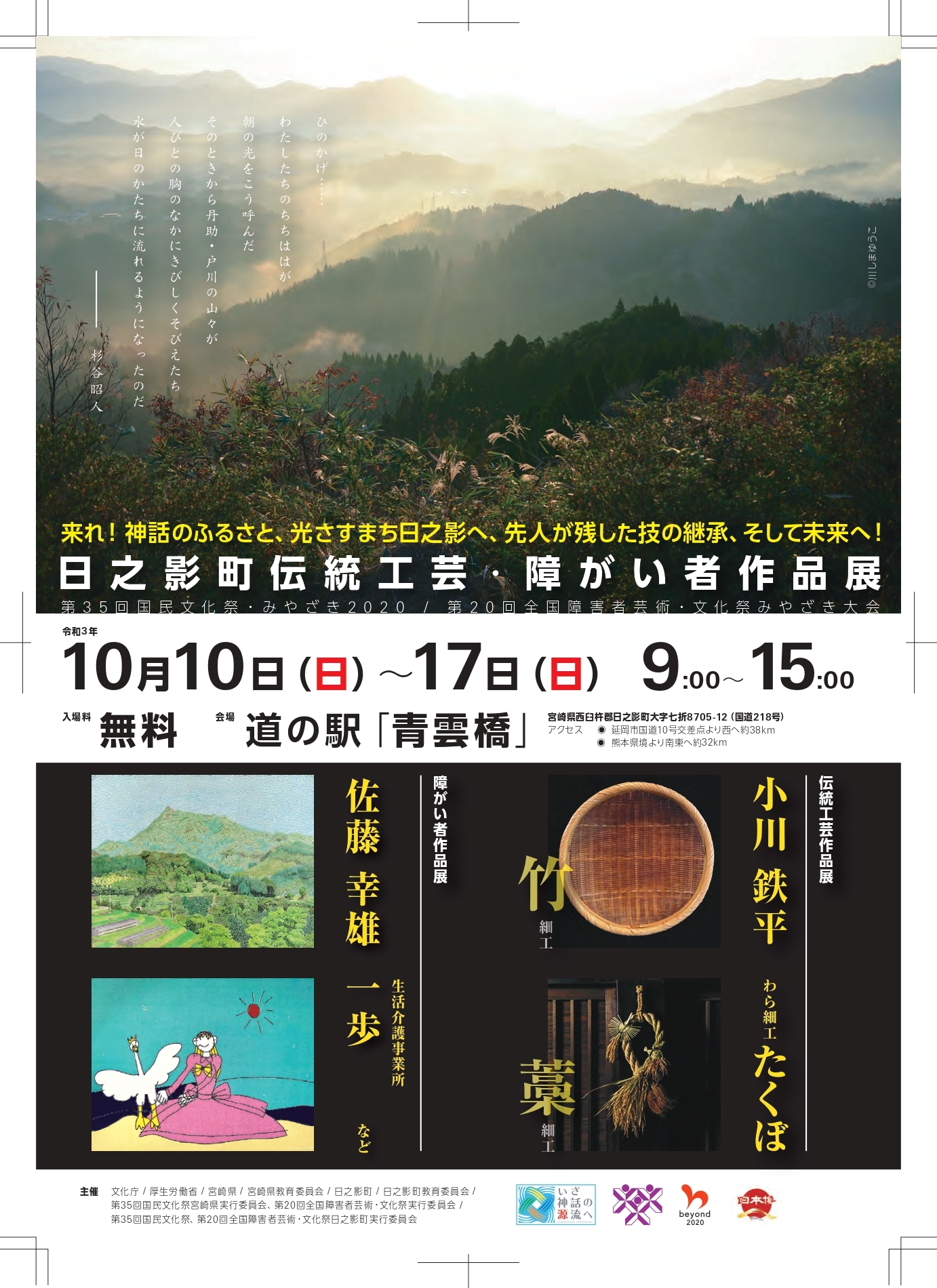 日之影町伝統工芸・障がい者作品展 hinokage 2021年9月27日 イベント情報 / お知らせ 第30回国民文化祭・みやざき2020/第20回全国障碍者芸術文化祭みやざき大会のイベントとして、 「日之影町伝統工芸・障がい者作品展が行われます。 今回は、「来れ!神話のふるさと、光さすまち日之影へ、先人が残した技の継承、そして未来へ!」というスローガンの下、伝統工芸作品展と、障がい者作品展を行います。 日時 令和3年度10月10日(日)~10月17日(日) 9:00~15:00 入場料 無料 会場 道の駅 青雲橋 おすすめ 現在ホームページのリニューアルを行っております。 2019年9月20日 【開催】ひのかげ栗直売市/ひのおかげ青雲朝市 2020年9月16日 福岡キャンピングカーショーへの出展(ひむか共和国主催) 2019年11月15日