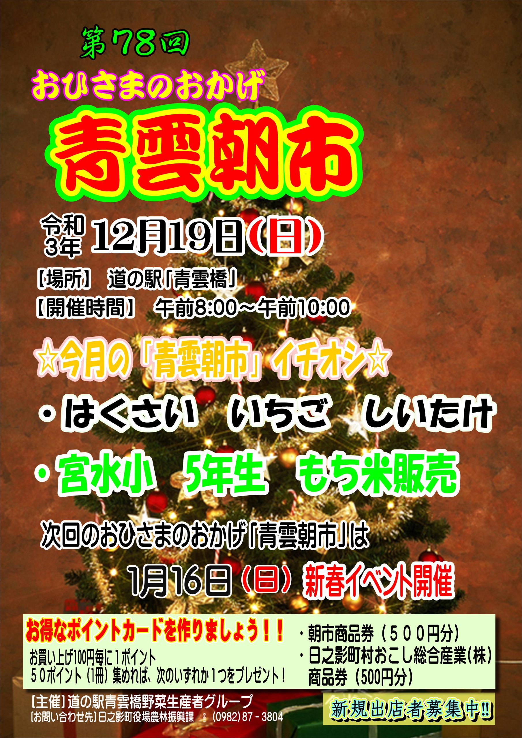 第78回おひさまのおかげ「青雲朝市」 hinokage 2021年12月10日 イベント情報 / お知らせ 日時:2021年12月19日 場所:道の駅青雲橋 内容:生産者の直売市です。毎回大好評の朝市。新鮮な野菜や朝早くか ら仕込んだ総菜などお買い得商品が満載です。 おすすめ 台風10号の接近に伴う村おこし総合産業(株)の営業時間等変更のお知らせ 2020年9月4日 日之影温泉駅の温泉施設再開延期について 2021年2月7日 ふるさとエール便で先着2000名に特産品プレゼント 2020年11月27日