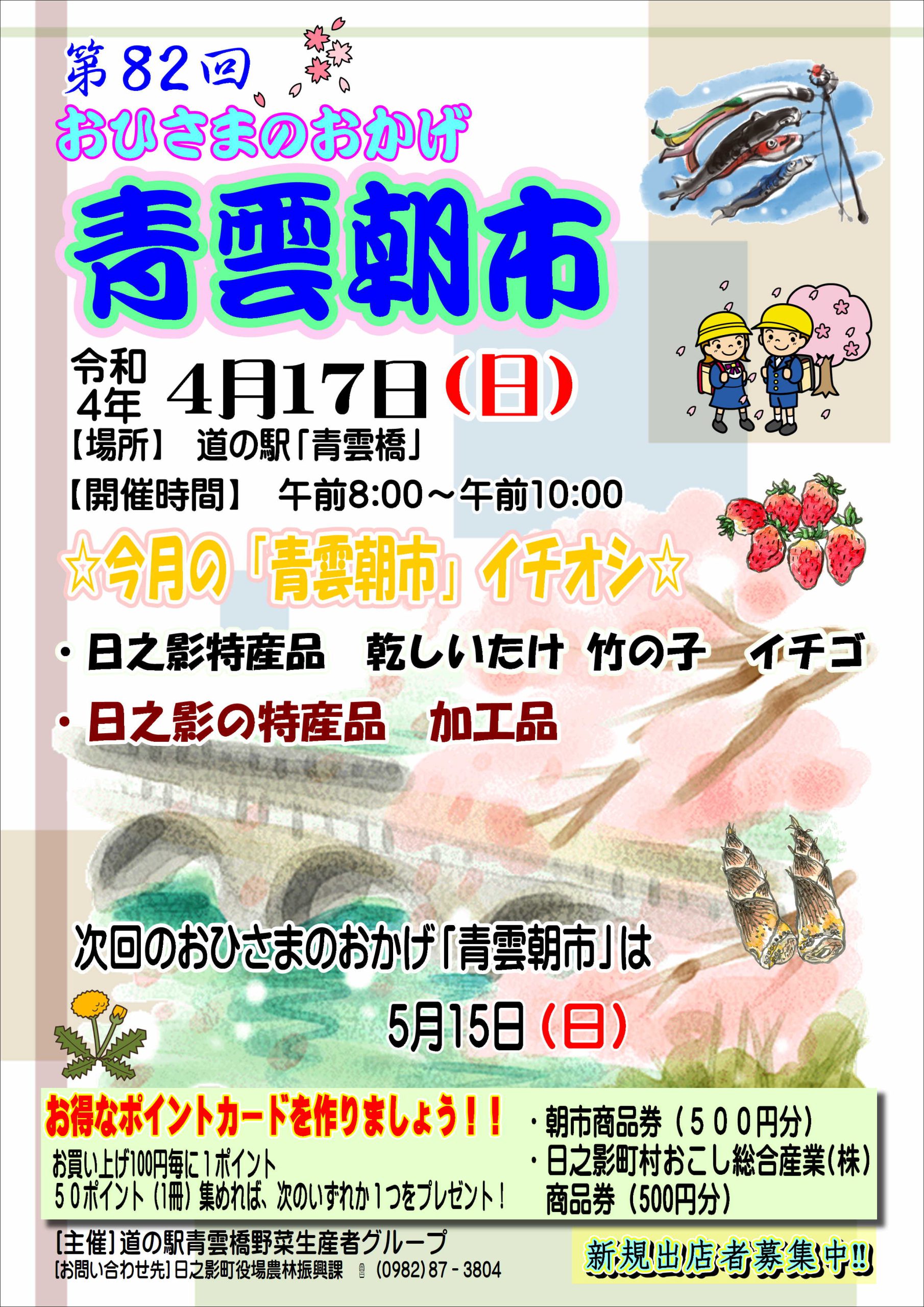 第82回 おひさまのおかげ「青雲朝市」 hinokage 2022年4月15日 お知らせ 日時:2022年4月17日 場所:道の駅青雲橋 内容:生産者の直売市です。毎回大好評の朝市。新鮮な野菜や朝早くから仕込んだ総菜などお買い得商品が満載です。 おすすめ ふるさとエール便で先着2000名に特産品プレゼント 2020年11月27日 第84回 おひさまのおかげ『青雲朝市』 2022年6月17日 県道6号線通行止めによる迂回路紹介動画について 2022年5月13日