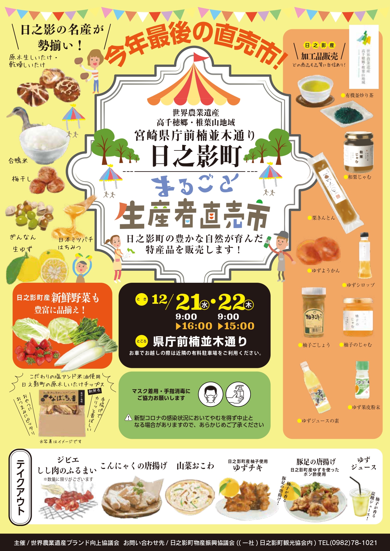 宮崎県庁前楠並木通り 日之影町まるごと生産者直売市 開催! hinokage 2022年12月13日 お知らせ 宮崎県庁前楠並木通り 日之影町まるごと生産者直売市 開催します! 日之影町の豊かな自然が育んだ特産品を販売します! 日之影自慢の特産品が勢ぞろい! ■日程 12月21日(水) 9:00~16:00 12月22日(木) 9:00~15:00 2日間 ■場所 宮崎県庁前楠並木通り ■お問い合わせ 日之影町物産振興協議会(日之影町観光協会内) 0982-78-1021 ※お車、自転車等でお越しの際は、近隣の有料駐車場をご利用ください。 当日駐車場は用意しておりません。 おすすめ 道路・森林セラピーロードの状況について 2020年9月9日 台風10号の接近に伴う臨時休業のお知らせ 2020年9月4日 ますたろう荘 休業のお知らせ 2022年4月11日